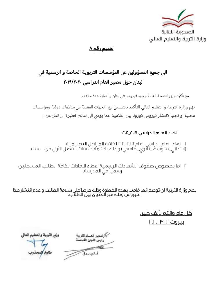 تعميم رقم تعاميم وزارة التربية والتعليم العالي في لبنان 2020
