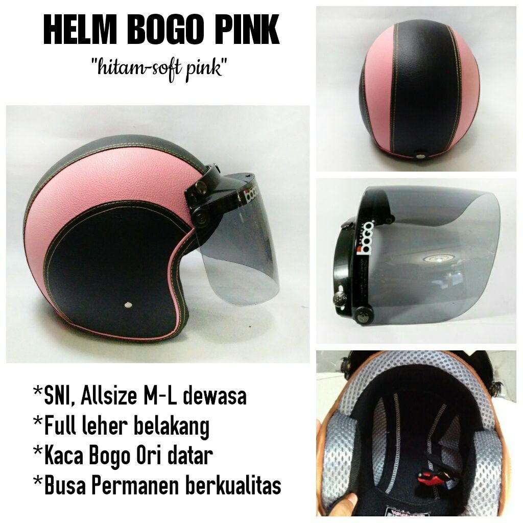 Helm Bogo Retro Full Kulit Hitam Softpink Kaca Bogo Ori Datar
