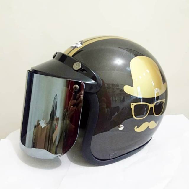 Jual Helm Retro Bogo Sni Motif Kumis Abuabu Semi Kulit Kaca Datar