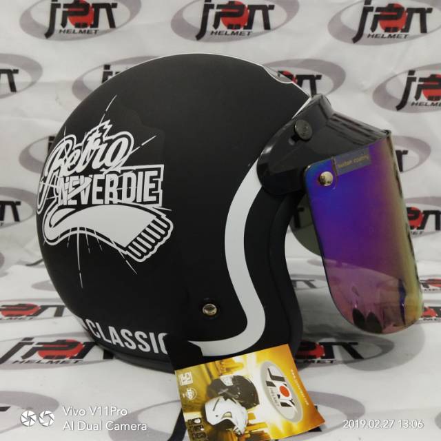 Helm Retro Helm Bogo Retro Jpn Arc Hitam Doff Kaca Visor Flat